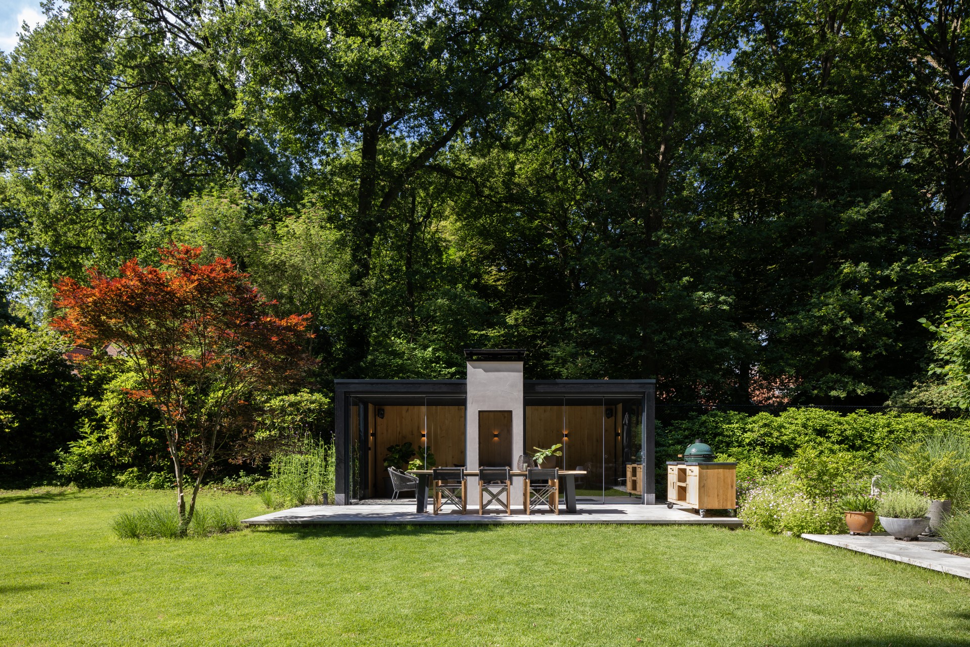 Deze luxe tuinkamer met doorkijkhaard van Bronkhorst staat in een oase van groen. U kunt uzelf hier even ontrekken van de drukte van uw dagelijkse leven. De haard met doorkijk is dé eyecatcher van het houten bijgebouw. Deze Douglashouten tuinkamer is behandeld met actranciet olie. De binnenkant is van Eikenhoutvwat een extra warme en natuurlijke uitstraling heeft. Als je de de glazen schuif-draaiwanden sluit is ook op de koudere dagen een fijne plek om helemaal tot rust te komen. De gashaard met een glazen doorkijk is afgewerkt met een lichtgrijze betonstuc. Optimaal genieten dus!