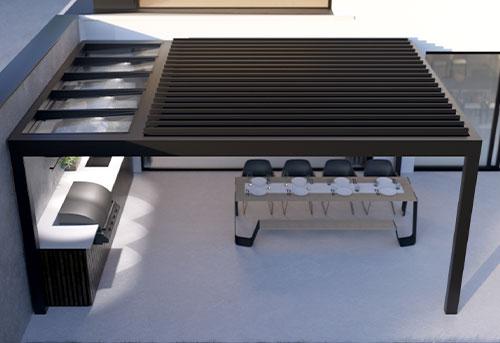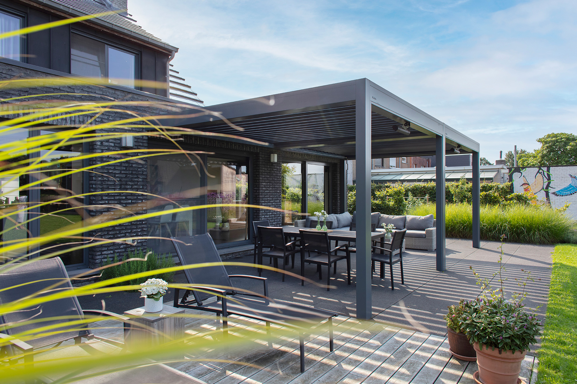 Terrasoverkappingen met een geautomatiseerd lamellendak bestaan uit lamellen die je naar wens kan kantelen. Veel zon, volledige schaduw of iets daartussen? It’s up to you. De B600 en B600 S overkappingen hebben kantelbare lamellen die ook bijna volledig kunnen openschuiven.