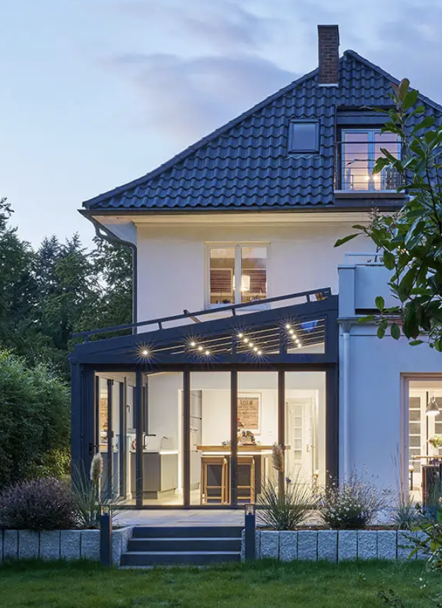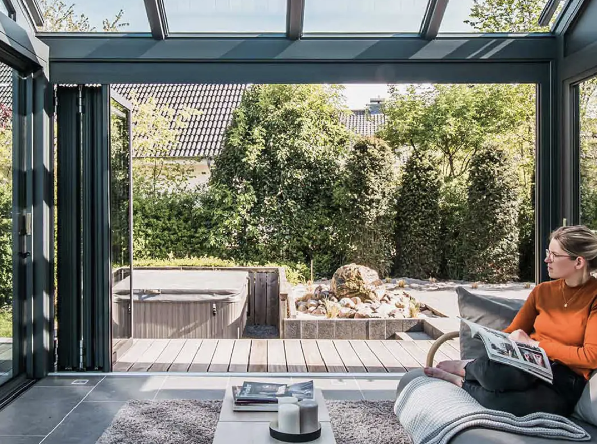 Een woonserre is dé manier om meer leefruimte te creëren én het hele jaar door te genieten van natuurlijk licht en de seizoenen. Dankzij de hoogwaardige glaselementen en de uitstekende warmte-isolatie van Solarlux blijft het binnen aangenaam, ongeacht het weer buiten.