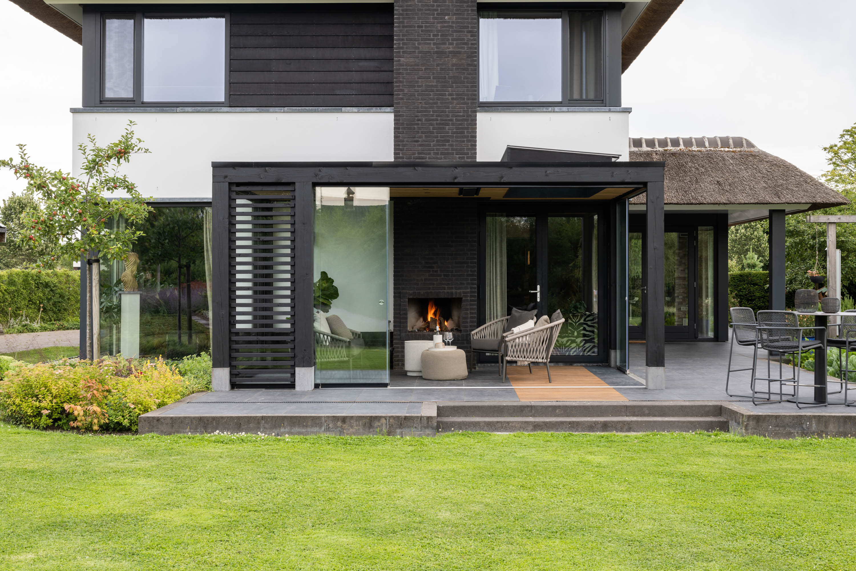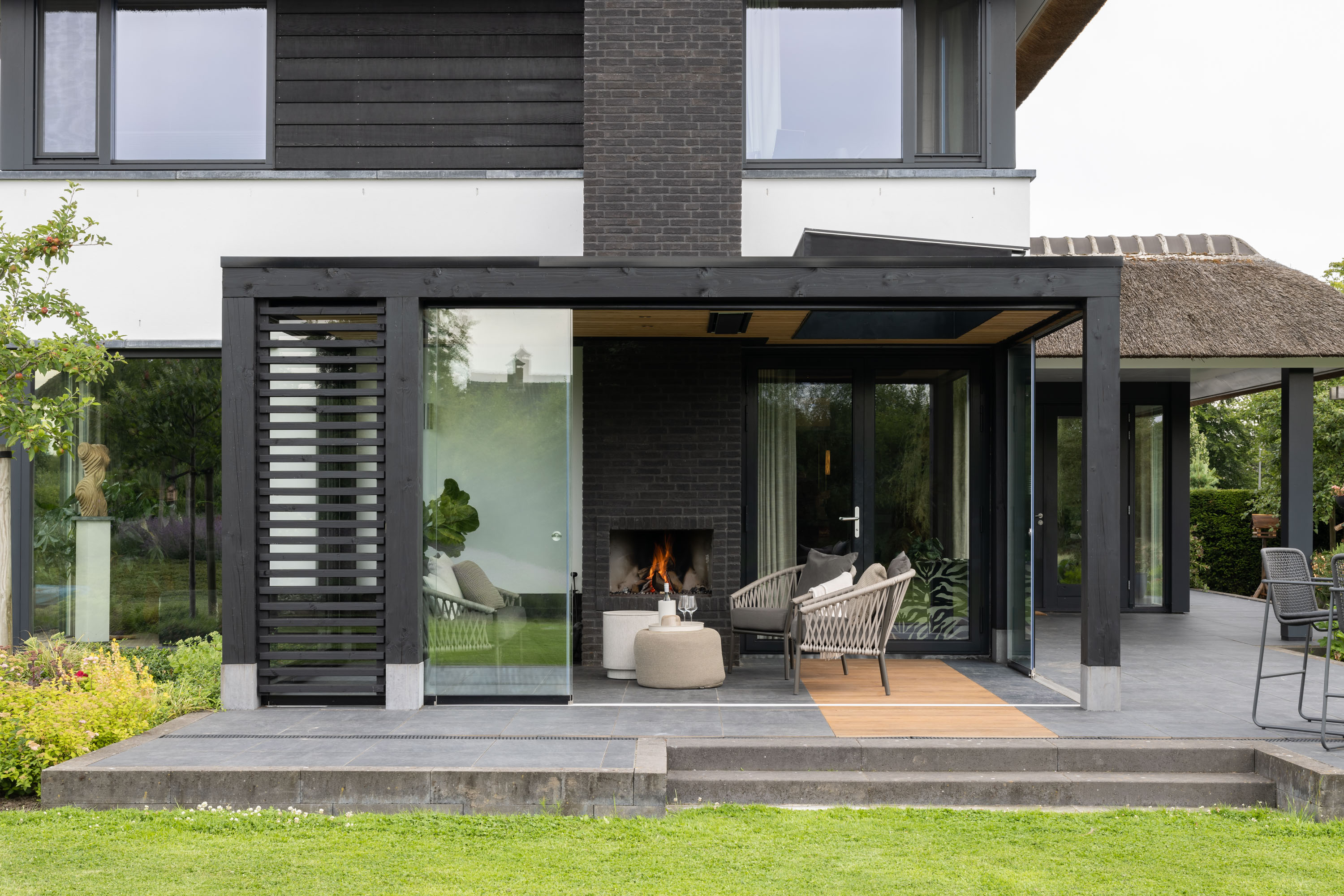 Een moderne veranda aan huis, voorzien van een lichtstraat boven de openslaande deuren van de woning. Deze houten veranda heeft veel comfortabele opties en is daardoor de perfecte plek om tot rust te komen. Denk hierbij aan inbouwheaters, plafondspots, haard, glazen schuifwanden en de grote lichtstraat. Een tweede woonkamer, maar dan tussen het groen van uw tuin.