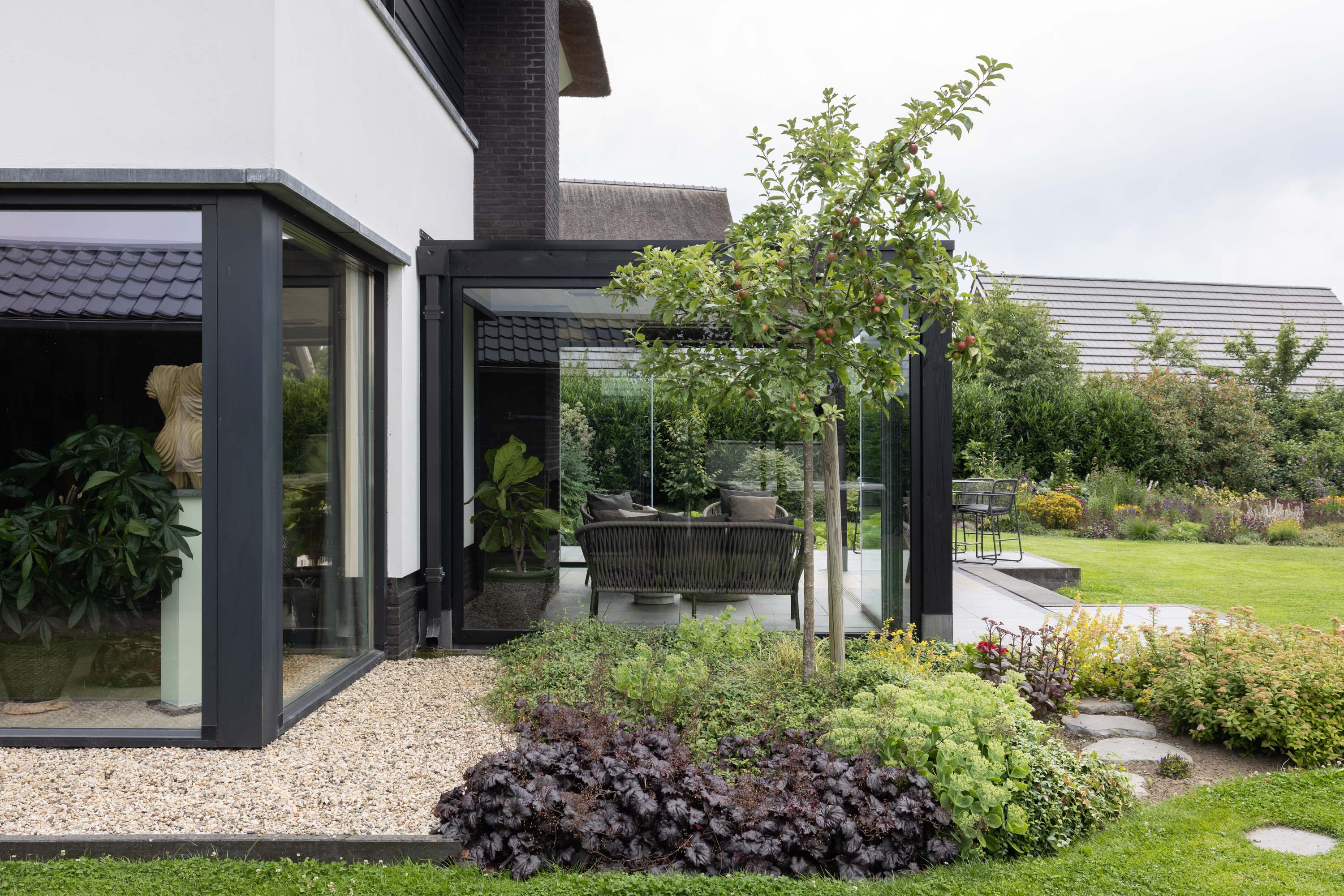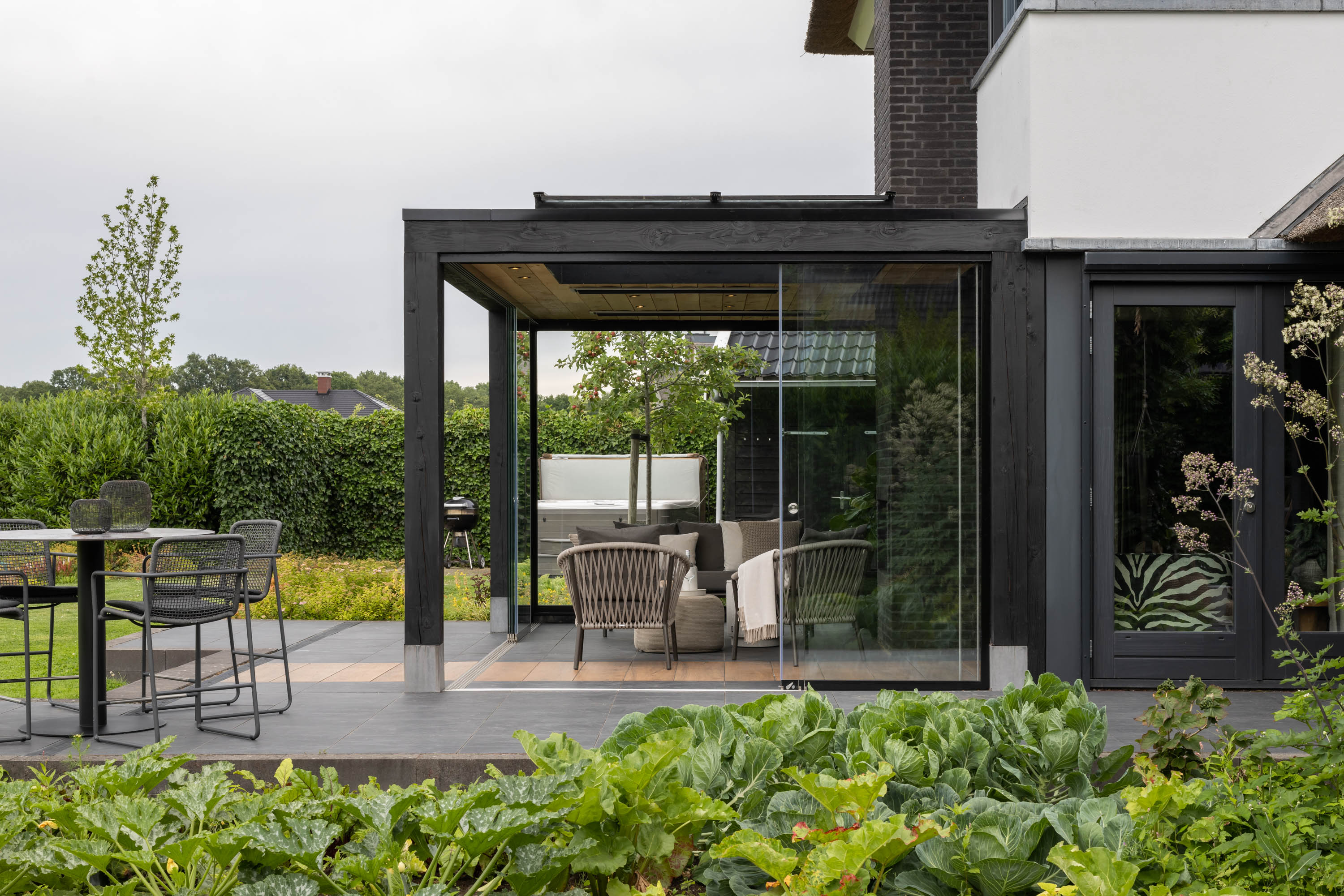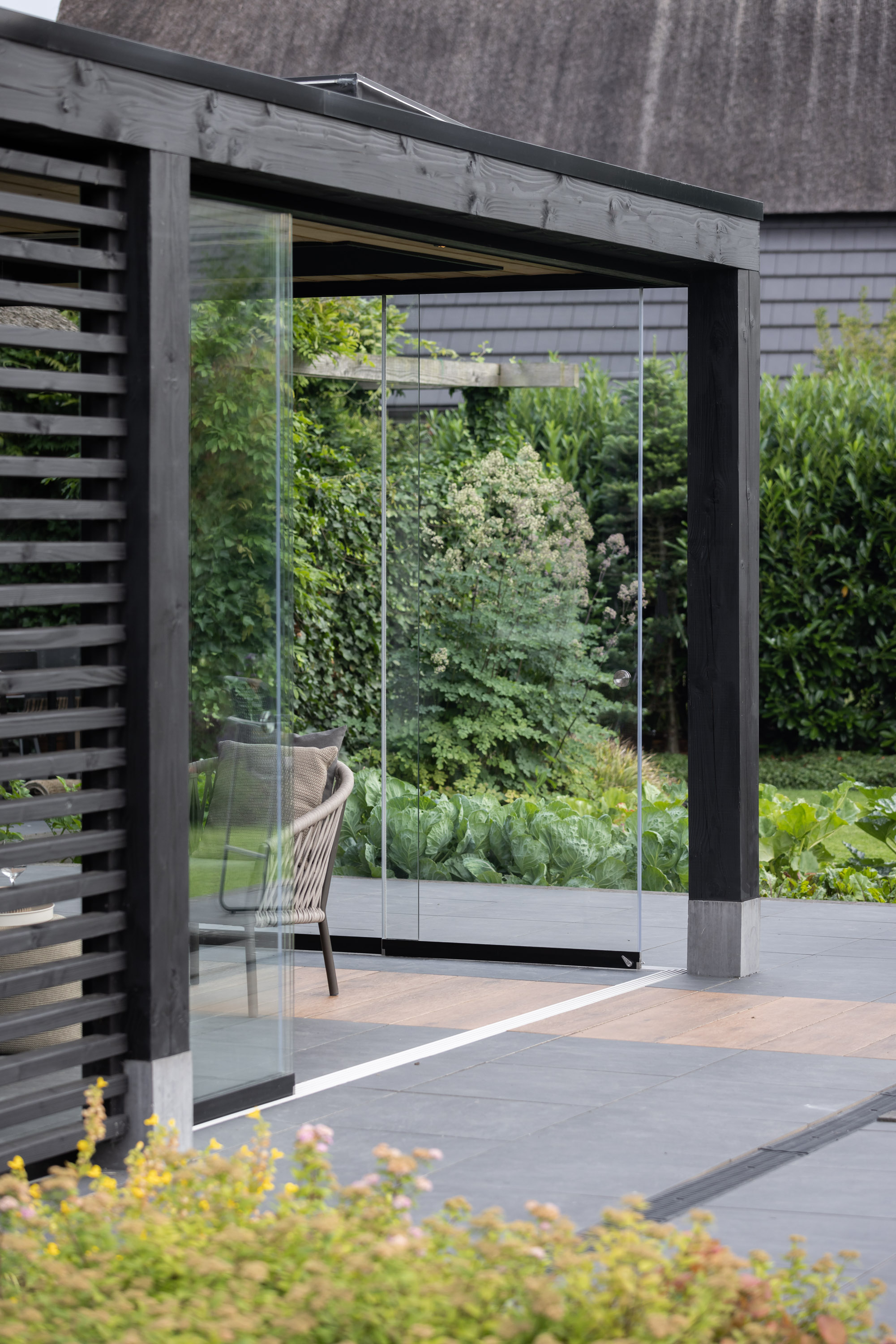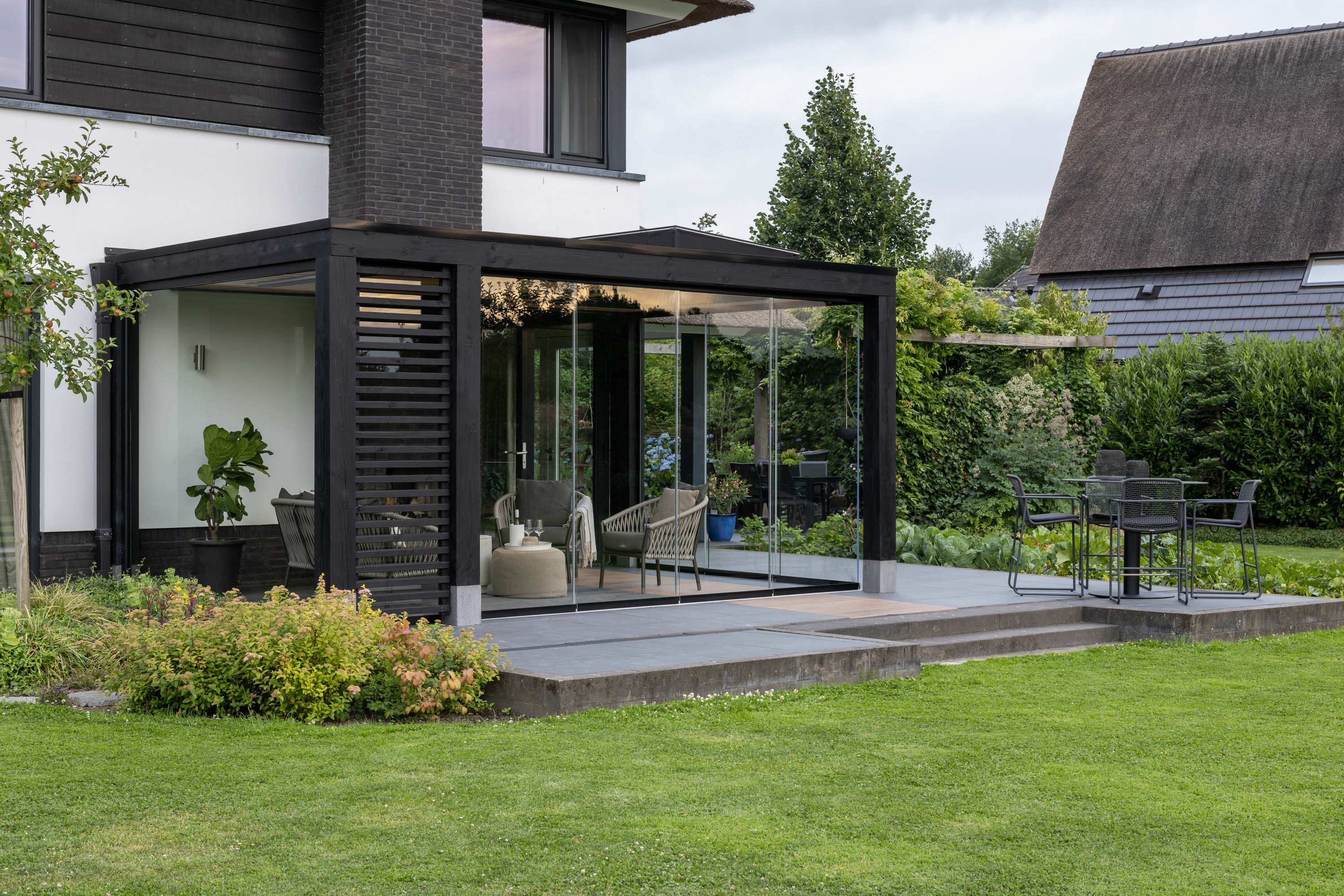 Moderne zwarte veranda met lichtstraat