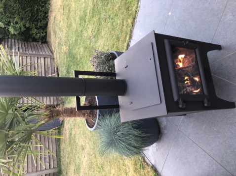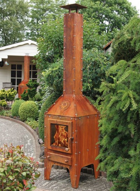Tuinhaard van cortenstaal op houtpellets brand met nagenoeg geen rookoverlast