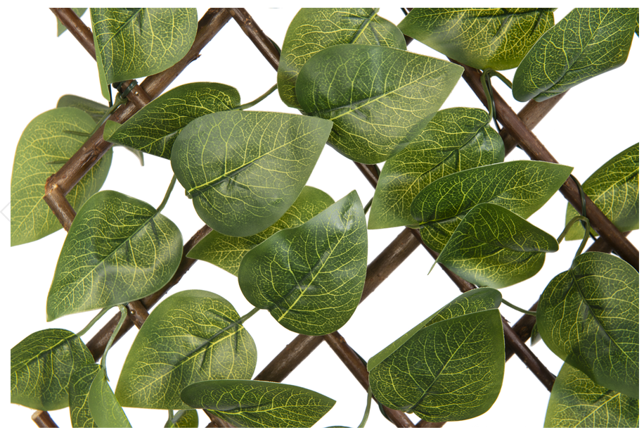 Verstelbaar klimrek van natuurlijk wilgenhout met kunststof bladeren van de laurierkers om een muur mee te versieren of om een balkon mee af te schermen.