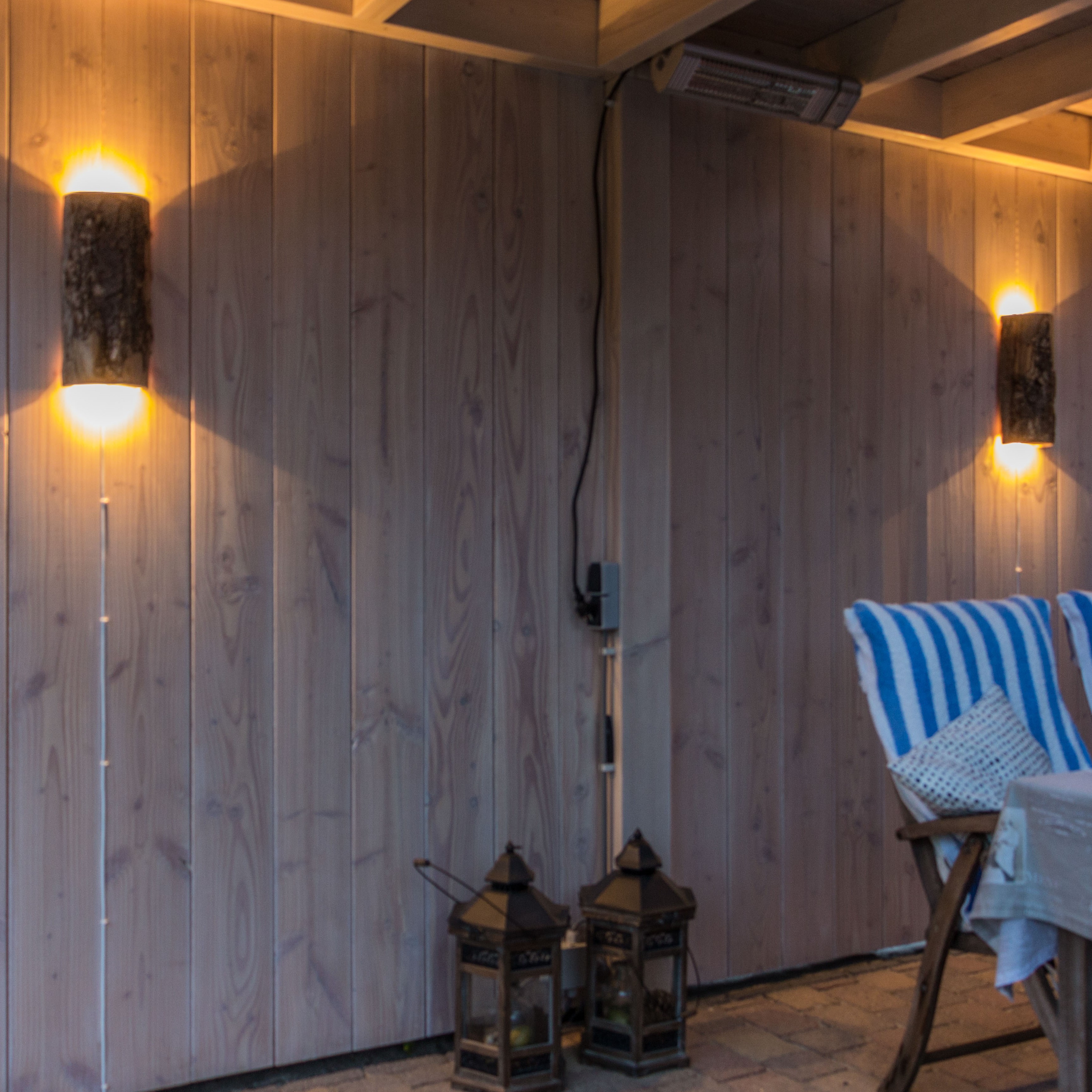 Om een natuurlijke omgeving één geheel te kunnen maken hebben we een wandarmatuur ontwikkeld welke voor buiten geschikt is en eenvoudig aan een muur of schutting bevestigd kan worden. Voor het aanlichten kan gekozen worden voor alleen licht omhoog, alleen omlaag of licht aan beide zijden. Door het slimme ophangsysteem kan het armatuur eenvoudig worden opgehangen zonder zichtbare schroeven. Eerst wordt het ophang systeem op de wand bevestigd en aangesloten waarna het houten element er “ingehaakt” kan worden. Als laatste nog één boutje om het houten element te zekeren tegen bijvoorbeeld diefstal.