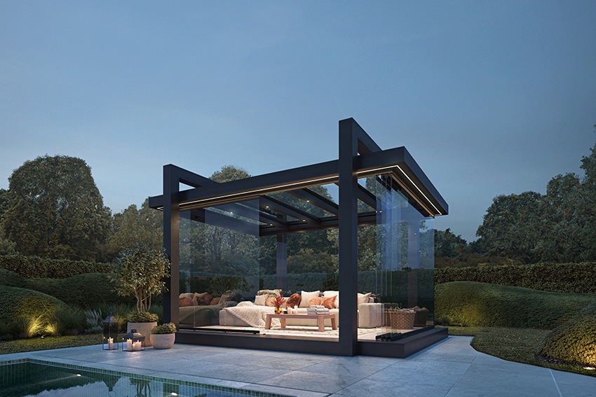 De tweede nieuwkomer van Metalura is tuinkamer Linea. Door de speciaal geplaatste profielen, lijkt het net of het dak zweeft. In combinatie met de geïntegreerde LED-verlichting ontstaat er een ongekende sfeer. De Linea is niet alleen als tuinkamer, maar ook als terrasoverkapping te plaatsen.