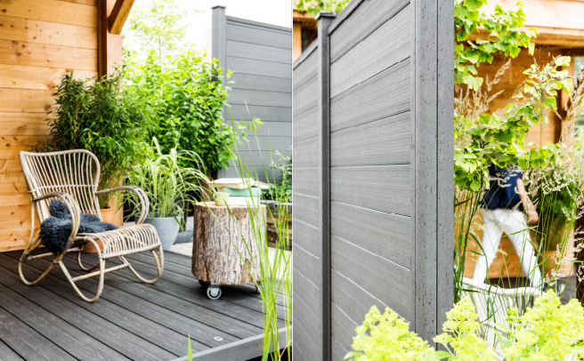 Primeur op de vtwonen&designbeurs 2015 is het volledige tuinassortiment van Duofuse, dat bestaat uit tuinschermen, tuinpalen, tuindeuren en terrasplanken. Duofuse is kwalitatief Het Duofuse natural look tuin/terrasassortiment is verkrijgbaar in 3 kleurstellingen: