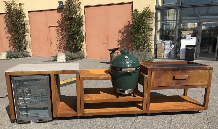 Dit deel is ontworpen voor een buitenkeuken koelkast. Of u nu kiest voor bakken, braden, slow cooking of pizza's bakken met de Zeno Kitchen Mobile modules kunt u dat allemaal realiseren. De Zeno Buitenkeukens zijn allemaal gemaakt van het bekende Corten-A staal wat een enorm duurzaam is. De afmeting van elke module bedraagt 1200x800mm. Het werkhoogte voor de Zeno Kitchen Mobile Tepan, en Freeze is 94cm. Dat is tevens de werkhoogte voor de Big Green Egg (Large). De standaard modules hebben geen afdekking van de Cortenstalen werkbladen. Naar keuze kan worden gekozen voor , keramische toplaag van 6mm in betonkleur of antraciet, of voor een RVS top van 2mm dikte. Eenvoudiger is de werkplek te voorzien van een houten snijplank.