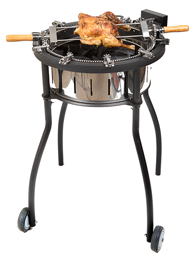 De basis van de RVS Smart BBQ is een groot draaiend tandwiel met een elektromotor, hierdoor draait je vlees spiesjes, vis en groente volledig automatisch boven de gloeiende kooltjes. Zo gaart alles heel gelijkmatig, brand je je handen niet en kun je gezellig borrelen met je gasten!