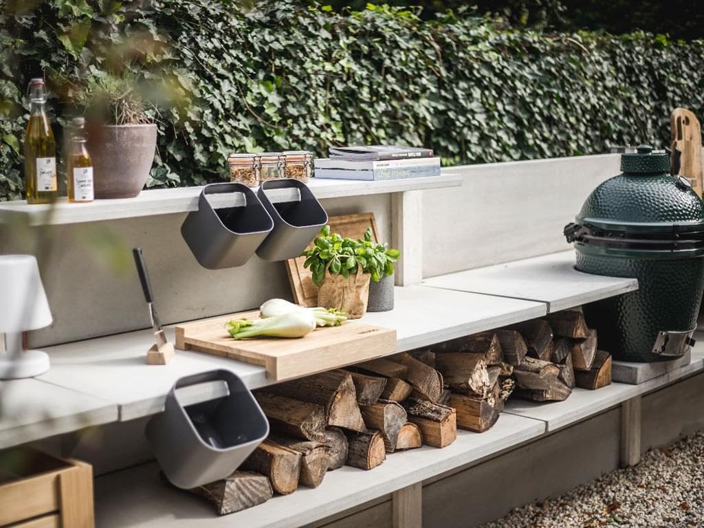 Denk aan extra planken die bevestigd kunnen worden in de buitenkeukens van WWOO en de hang on planten en kruiden bakjes, samen met de houten boxen. Meer in de ruimte werken, zorgt voor meer dynamic en geeft het gevoel dat de tuin groter lijkt.