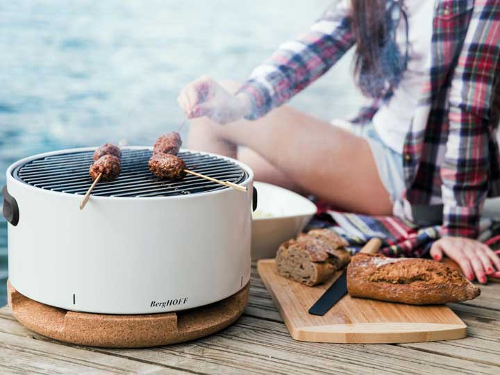 In de tuin, het park of op het strand: met de draagbare tafelbarbecue van BergHOFF kun je waar je maar wil een gezellige barbecue party organiseren. Plaats de barbecue op tafel en iedereen kan zelf zijn eigen stukje vlees, vis of groente grillen. Het deksel van kurk gebruik je tijdens het barbecueën als onderzetter; op die manier kan je de luchttoevoer eenvoudig controleren. Met een doorsnede van 35cm is de tafelbarbecue compact, toch kun je er met gemak met 8 personen mee grillen. De tafelbarbecue weegt slechts 5 kilo en is eenvoudig overal mee naar toe te nemen dankzij de draagriem. De BergHOFF tafelbarbecue is verkrijgbaar in zwart en wit bij onder andere tuincentra, kookspeciaalzaken en online.
