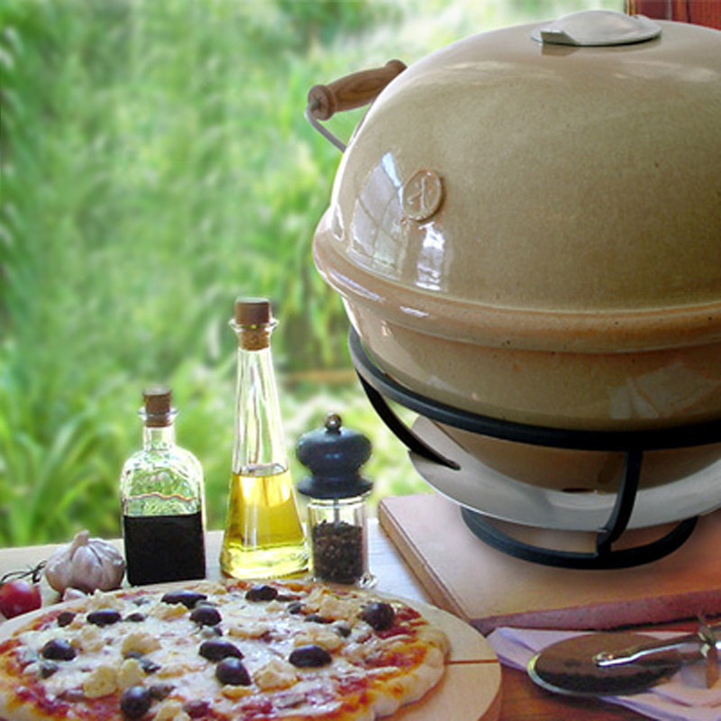 Keramische pizza-ovenDeze Zuid-Afrikaanse keramische pizza-oven van African Flame is eenvoudig te bedienen. Het opwarmen met houtskool duurt maar 30 minuten, de oven kan vervolgens de hitte van 350 graden uren behouden. Deze hoge temperatuur en de poreuze pizzaplaat is het geheim achter de heerlijke authentieke pizza's. De oven is multifunctioneel, want hij kan ook als barbecue en rookoven dienen. De pizza oven is in drie kleuren verkrijgbaar: zwart, terracotta/bruin en mooi rood.