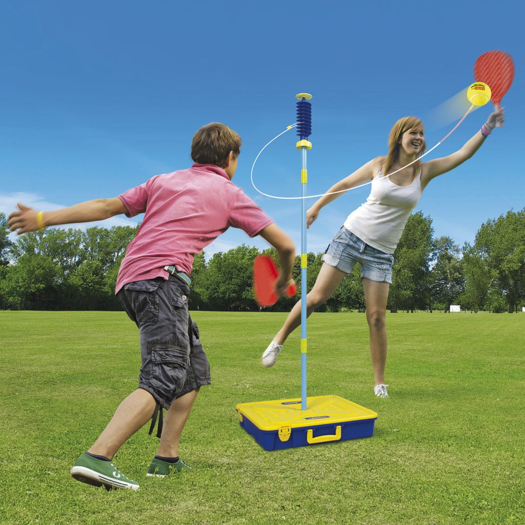 De tennisspelen van Swingball zijn het meest bekend. Alleen of met zijn tweeën sla je een tennisbal die vastzit aan een touw rond een paal. Allerlei spelregels zijn er op los te laten maar alleen al het oefenen van de tennisslag is leuk om te doen. Dit tennisspel is beschikbaar in diverse varianten. Zo is er de ?My First Swingball?. Deze versie is geheel afgestemd op kinderen vanaf drie jaar en bevat extra grote lichtgewicht rackets en een bal van schuim materiaal in plaats van een (harde) tennisbal. Ook is er een uitvoering onder de naam Super Swingball. Bij dit spel kun je de paal direct in de grond steken en wordt ieder grasveld geschikt voor een potje Swingball. Daarnaast zijn er nog versies waarvan de verpakking, de kunststof opbergbox, tevens dient als voet. Met deze versies kan dus overal gespeeld worden, ook op een betegelde binnenplaats.
