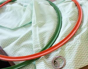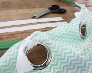 - Haal een strook stof door een ring en bevestig het gordijn (met een dubbele knoop) hiermee aan de hoepel.