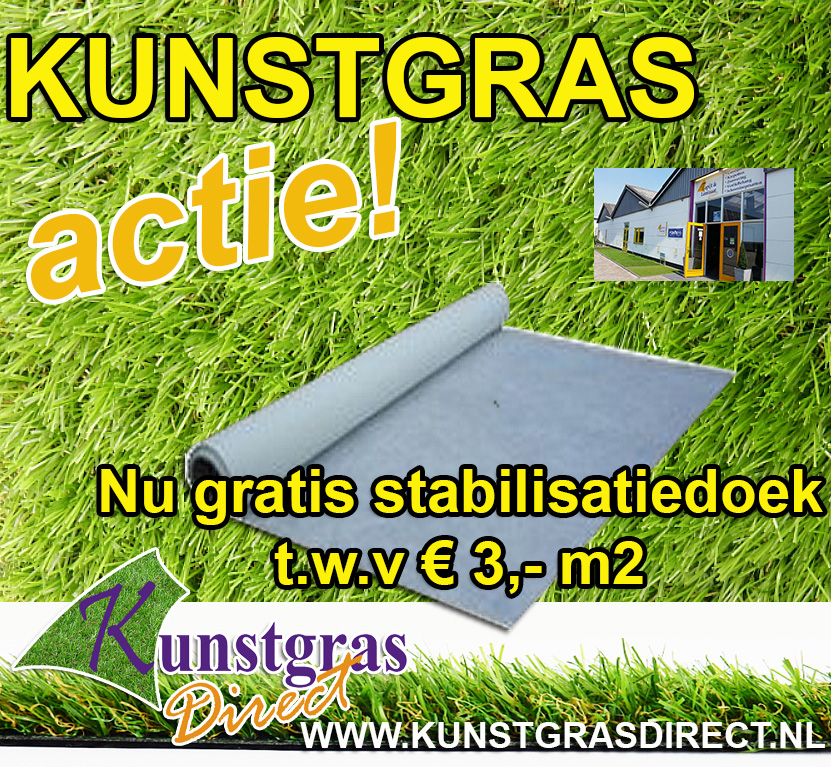 Onze tijdelijke Kunstgras Actie, bovenop de lage prijzen van ons kunstgras nu ook nog tijdelijk stabilisatiedoek t.w.v. € 3,- per m2.