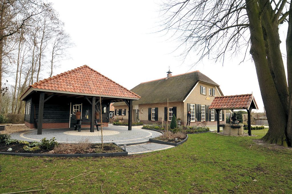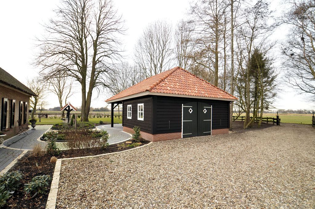Deze eiken tuinkamer met veranda is een klassieker. Door de oud lijkende pannen en de robuuste afwerking past dit gebouw mooi op een groot erf of landgoed.