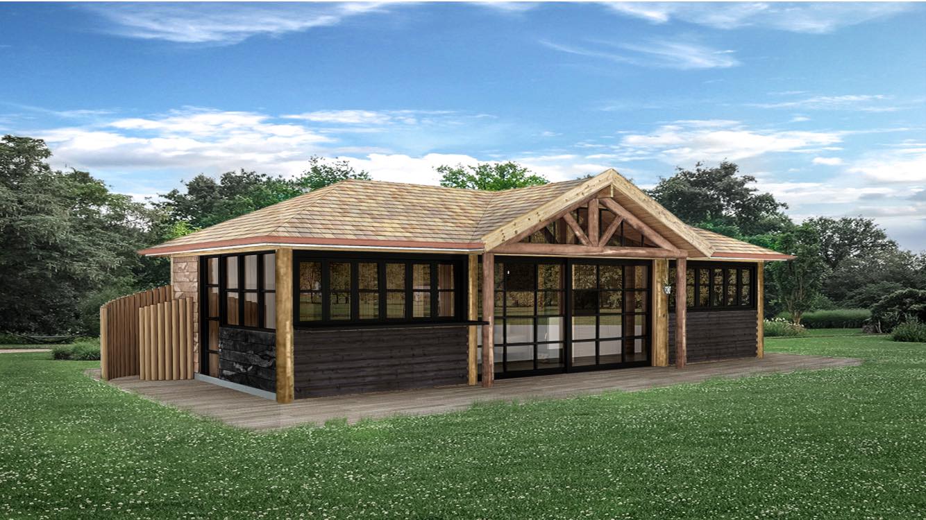Dit is een Natuurlijk Organisch loghome style (bijzondere ontwerpen van rondhout en groene daken).