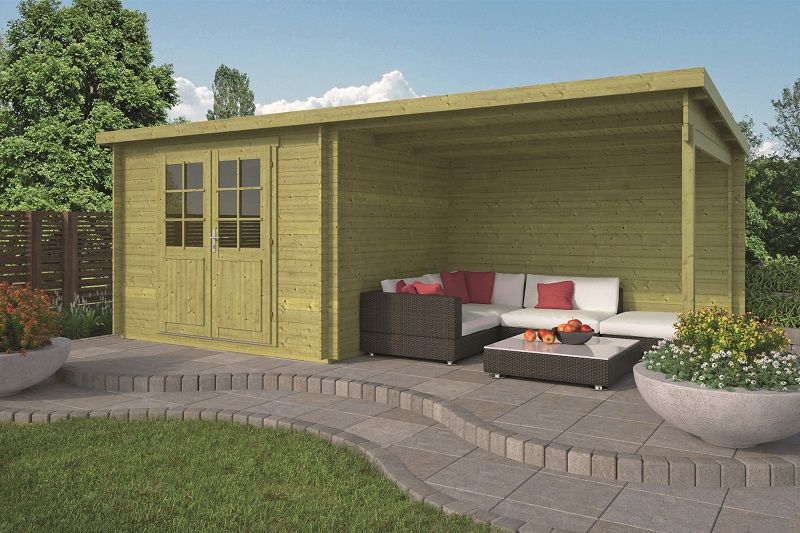 Geïmpregneerde blokhutten gemaakt van behandeld vurenhout en staan garant voor een goede weersbestendigheid.