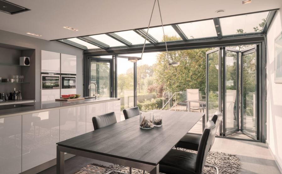 Een verbouwing hoeft niet groots te zijn om een groots effect te hebben. Een uitbouw met een serredak en glazen vouwwanden kan al wonderen doen.