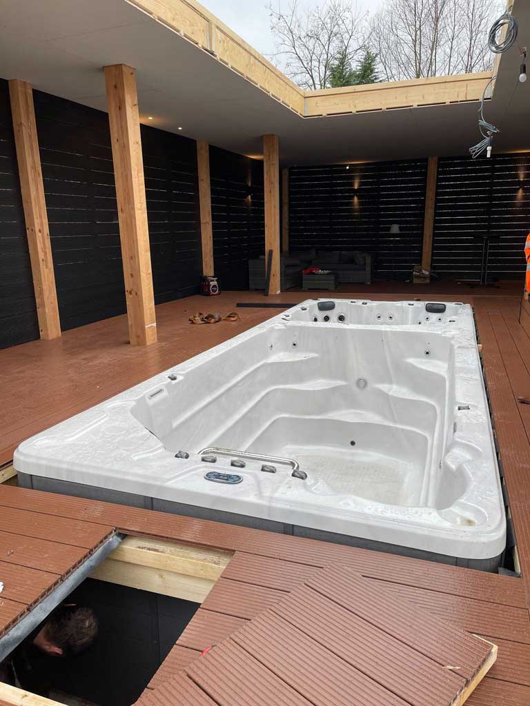 Dat lijkt wat klein voor beide, maar het zwembad is voorzien van tegenstroom, zodat je toch lekker door kunt zwemmen. De watertoevoer voor dit zwembad en de jacuzzi loopt via het huis. Voor het terras zijn de terrasplanken van UPM ProFi Deck gebruikt, een Fins product dat in Duitsland geproduceerd wordt. Deze planken zijn niet alleen voor de vloer gebruikt, maar in een contrasterende kleur ook voor de bekleding van de zijkanten van het tuinhuis. Over dit product is goed nagedacht. Het is gemakkelijk te onderhouden en wordt in een complete verpakking, inclusief bevestigingsmaterialen, geleverd. Details zijn belangrijk voor een project als deze, dus het systeem heeft een aantal slimme accessoires. Zo heeft UPM ProFi Deck een gepatenteerde oplossing voor traptreden en rubberen strips. Zo kun je de vloer waterdicht maken én je voorkomt dat er vuil tussen de vlonderplanken valt. Heb je bijvoorbeeld een keer wijn gemorst? Geen probleem! Je kunt het gemakkelijk wegvegen en er blijven geen resten achter.