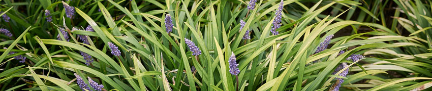 6. Leliegras – Liriope muscari: Leliegras is een laagblijvend grassoort en perfect als bodembedekker of borderplant. Hij wordt ongeveer 30 cm hoog en bloeit met mooie bloemetjes. Leliegras ‘Monroe White’ bloeit met schattige witte bloemetjes. Leliegras ‘Ingwersen’ bloeit met mooie paarse bloemetjes, die aan blauwe druifjes doen denken. Het is een sterkte vaste plant die gemakkelijk is in onderhoud, hij is winterhard en wintergroen.