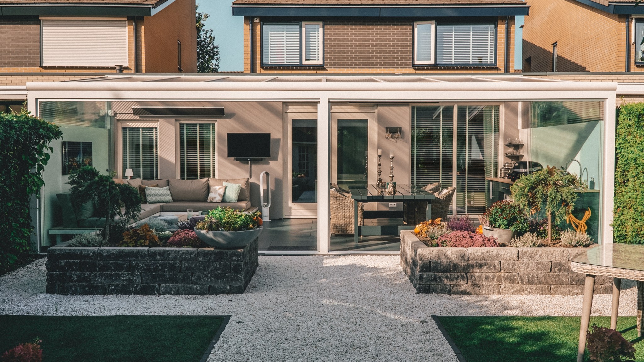 Als het op de zomeravonden afkoelt kun je met de afgesloten schuifwanden heerlijk binnen blijven zitten. Door al het glas warmt de tuinkamer zichzelf makkelijk op met een zonnetje erop, maar het zal nooit té warm worden als de felle zon aan de hemel staat. Schuif de glasschuifwanden open en verwelkom de frisse buitenlucht. Ideaal om zomers in en uit te lopen met een gezellige barbecue.