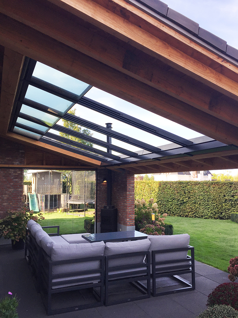 Houten veranda met elektrisch glazen dak
