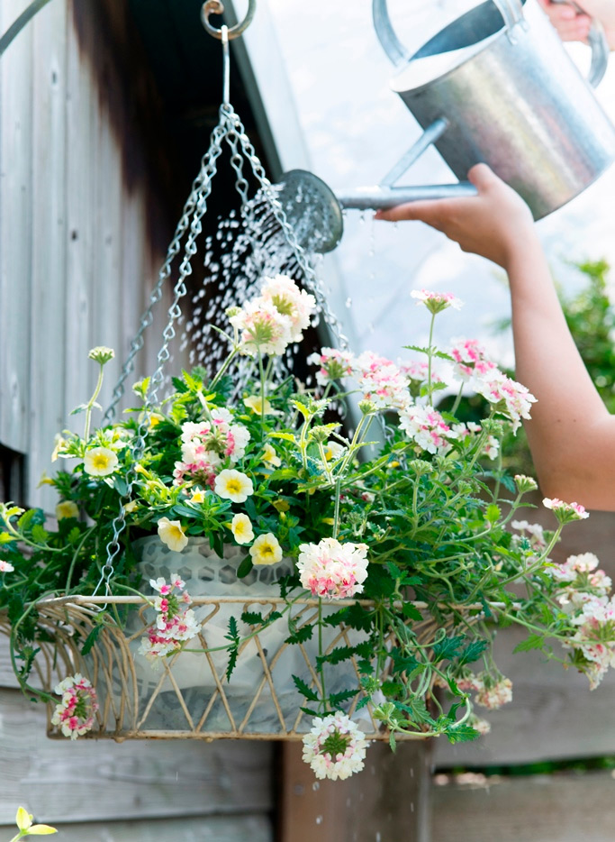 Bij het tuincentrum zijn er volop kant en klare hanging baskets verkrijgbaar. Het is een kwestie van ophangen en… genieten maar. Wil je er eentje zelf maken? Dat is heel eenvoudig. Zet de hanging basket eerst op een emmer zodat hij stevig staat. Bekleed de mand met een inlegvel van kokosvezels en maak inkepingen in de zijkanten. Vul de mand met grond en plant jouw favoriete zomerbloeiers. Begin met de hangplantjes aan de zijkanten die je via de inkepingen in het inlegvel in de grond zet. Beplant vervolgens de bovenkant en zet daarbij hangplantjes en lage planten langs de rand en in het midden een of meer planten die omhoog groeien.