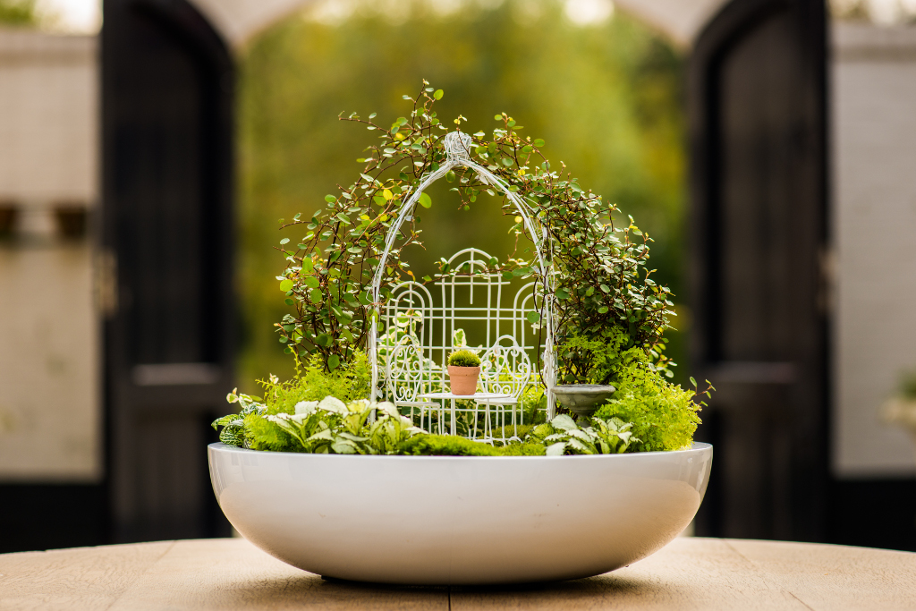 Romantisch, strak of sprookjesachtig? Een kwestie van miniplantjes kiezen op de miniplanten afdeling in het tuincentrum en dan decoreren met de juiste accessoires van Mason Mini Gardens. In een pot van zo’n 40 cm doorsnede gaan circa 8 mini plantjes. Leid bijvoorbeeld wat klimplantjes omhoog tegen het rozenboogje, leg een tuinpad aan met kiezeltjes of mos en zet daar een bruggetje overheen. Maak je unieke siertuintje compleet met een klein terrasje met zitmeubeltjes, mini potterie en plaats een hekje of kleine coniferen om je tuintje.