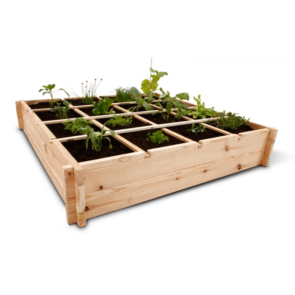 Je kunt natuurlijk zelf een stuk afbakenen in je tuin maar je kunt ook kiezen voor de MeterMoestuin van Landgoed. Dat is een houten bak van 100 x 100 cm en 20 cm hoog. Deze bak is voorzien van latjes om de vierkante meter in 16 gelijke vakken te verdelen. Zo kun je gemakkelijk allerlei verse groeten en fruit kweken, om zelf van te genieten.