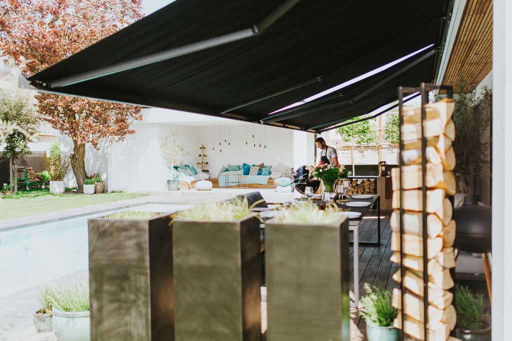 Durf jij het aan? Donkere tinten in je tuin of op je balkon? Donkere tinten geven een tuin of balkon een luxe uitstraling. Kies bijvoorbeeld voor een hippe donkere schutting, dit geeft diepte aan de tuin, waardoor de tuin ruimer lijkt dan hij is. Donkere meubels zorgen voor een moderne look. En op een donkere tafel komt je servies vaak prachtig uit. Een andere mogelijkheid is een zonnescherm in donkere tinten. De knikarmschermen van Harol hebben ‘Invisibly Wired’ armen, een exclusieve en zeer luxueuze afwerking waarbij de staalkabels zijn weggewerkt in de armen en niet langer meer zichtbaar zijn. Deze zonneschermen zijn niet alleen functioneel, maar ook nog eens stijlvol en een echte eyecatcher.