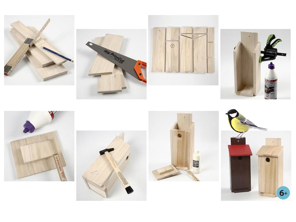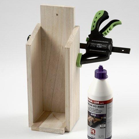 4 | Monteer het vogelhuis volgens de instructies. Lijm de stukken aan elkaar met Dana Super Hobby Lijm en klem ze vast voor het drogen.