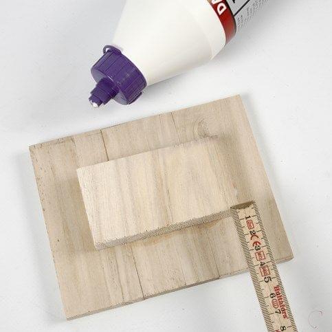 5 | Het dak. Lijm de 3 stukken hout voor het dak aan elkaar. Bevestig vervolgens een 9,5 x 9,5 cm stuk hout. Plaats dit 4 cm vanaf een van de lange kanten van het dak. Zie afbeelding.