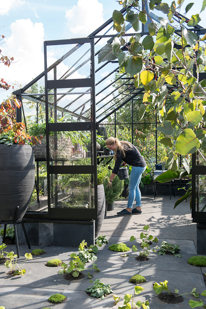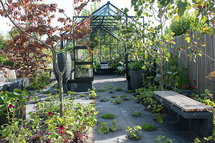 Harvesting Elements (ontwerp Wim Wijsman): tuinkas Bourton (www.royalwellkassen.nl), vaste planten (www.griffioenwassenaar.nl), tegels GeoVegtale (www.mbi.nl), waterplanten (www.moerings.nl), potten (www.capi-europe.com), overige decoratie (www.edelman.eu), automatische tuinbesproeiing (www.gardena.nl), keerwanden en U-element (www.terrasentrends.nl).
