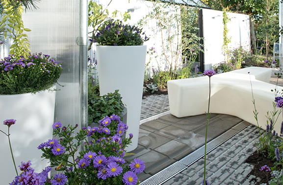 Steeds meer woningen worden ‘smart homes’. Technologieën zorgen daarbij voor een comfortabele leefomgeving en gemak. De tuin ‘New Frontiers’ sluit aan bij deze ontwikkelingen, bijvoorbeeld met tuinonderhoud via een app en verlichting op zonnepaneeltjes. Om de beleving van smart technologie te benadrukken, heeft deze trendtuin een futuristisch uiterlijk door het gebruik van (semi)transparante en reflecterende materialen. Toch blijft het geheel uitnodigend door de basiskleuren wit, paars en zilver en de toepassing van veel planten met aantrekkingskracht op bijen, vlinders en andere bestuivers. Het watermanagement is goed geregeld. De waterdoorlatende bestrating is een mix van steen en glassplit. Ook via speelse watertegels die uitmonden in rvs goten kan overtollig regenwater wegvloeien. Tijdens een stortregenbui ontstaan zo geen grote plassen, maar zakt het water juist snel de grond in. Een besproeiingscomputer met bodemvochtigheidssensor zorgt automatisch dat de planten uitsluitend water krijgen als het nodig is. Daarmee kan een forse waterbesparing gerealiseerd worden.