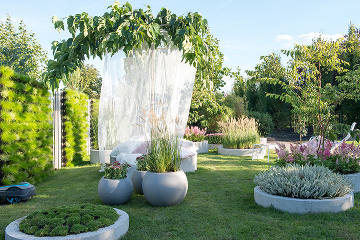 gevoel geeft dat je door een enorm kussen wordt opgevangen. In deze trendtuin tuin overheersen vriendelijke pasteltinten. Het gazon speelt een belangrijke rol. Niet alleen een plek om met blote voeten te betreden maar ook praktisch: regenwater zakt, in tegenstelling tot een betegelde tuin, direct weg in de bodem. Een robotmaaier zorgt dat het gras automatisch gemaaid wordt. Bomen en struiken zijn uitnodigend voor vogels en tuinbloeiers zijn bij- en vlindervriendelijk. Siergrassen zorgen voor extra zachte uitstraling.