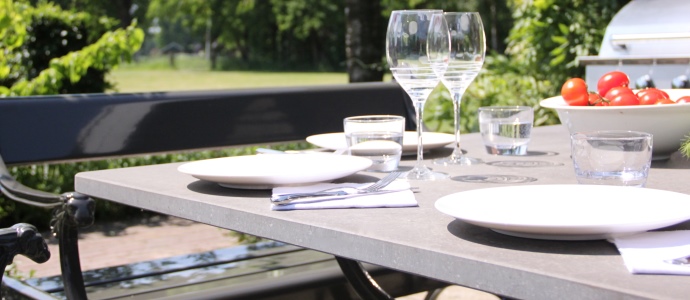 De Hestia tuinset bestaat standaard uit een Hestia tuintafel, vier Afrodite tuinstoelen en twee Afrodite tuinbanken.