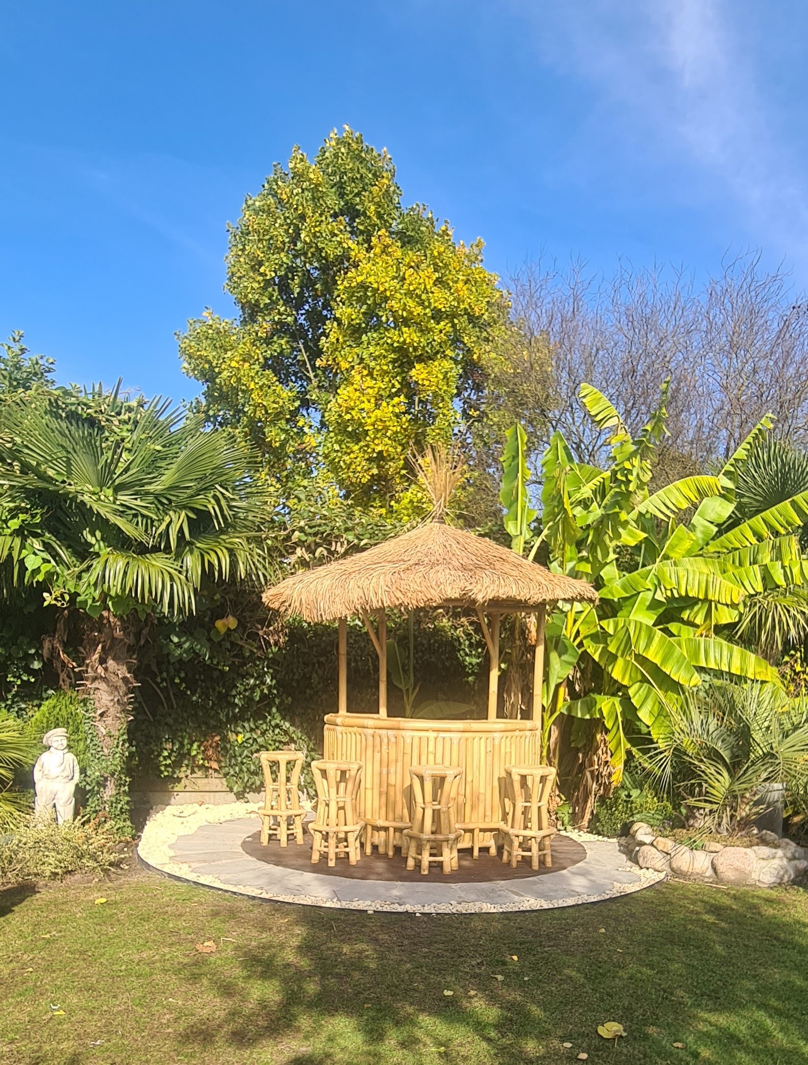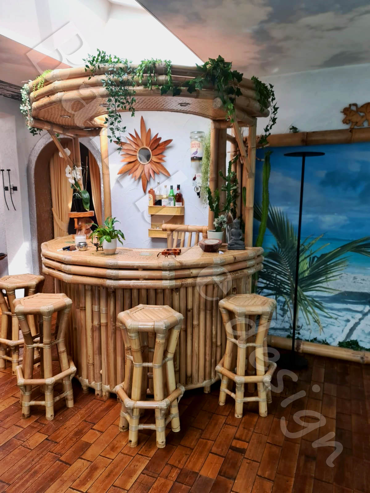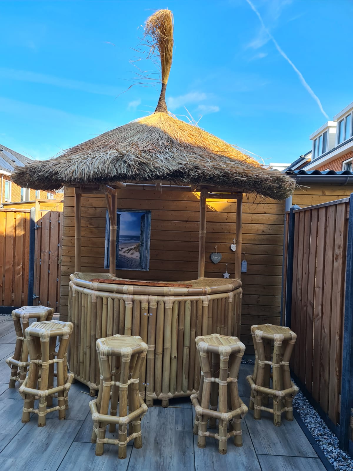 De tikibar: Een mooie bar voor binnen of buiten, om gezellig samen gezellig wat te drinken of te ontspannen in een tropische sfeer. Voor binnen hebben we een nieuwe bar ontworpen: onze cocobar. Deze bar past qua hoogte ook in uw woonkamer. Met deze bar haalt u de gezelligheid in huis.
