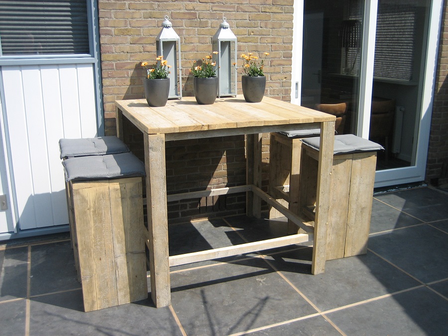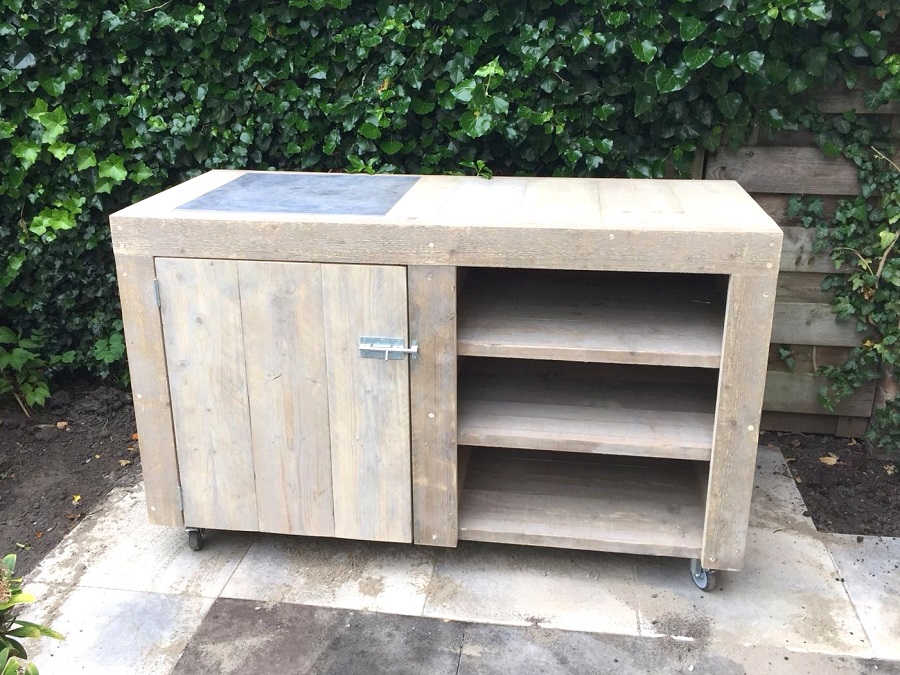 Buitenkeuken gemaakt van 3cm dik massief, gebruikt steigerhout. Het blad ingelegd met dikke stenen en het geheel op wielen geplaatst zodat hij ook naar een andere plek gereden kan worden.