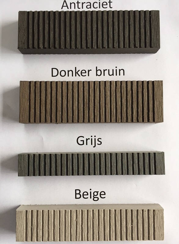Opdek uit BPC (= Bamboo Plastic Composite ) in de kleur antraciet, grijs, beige of donker bruin voorzien van RVS bouten.