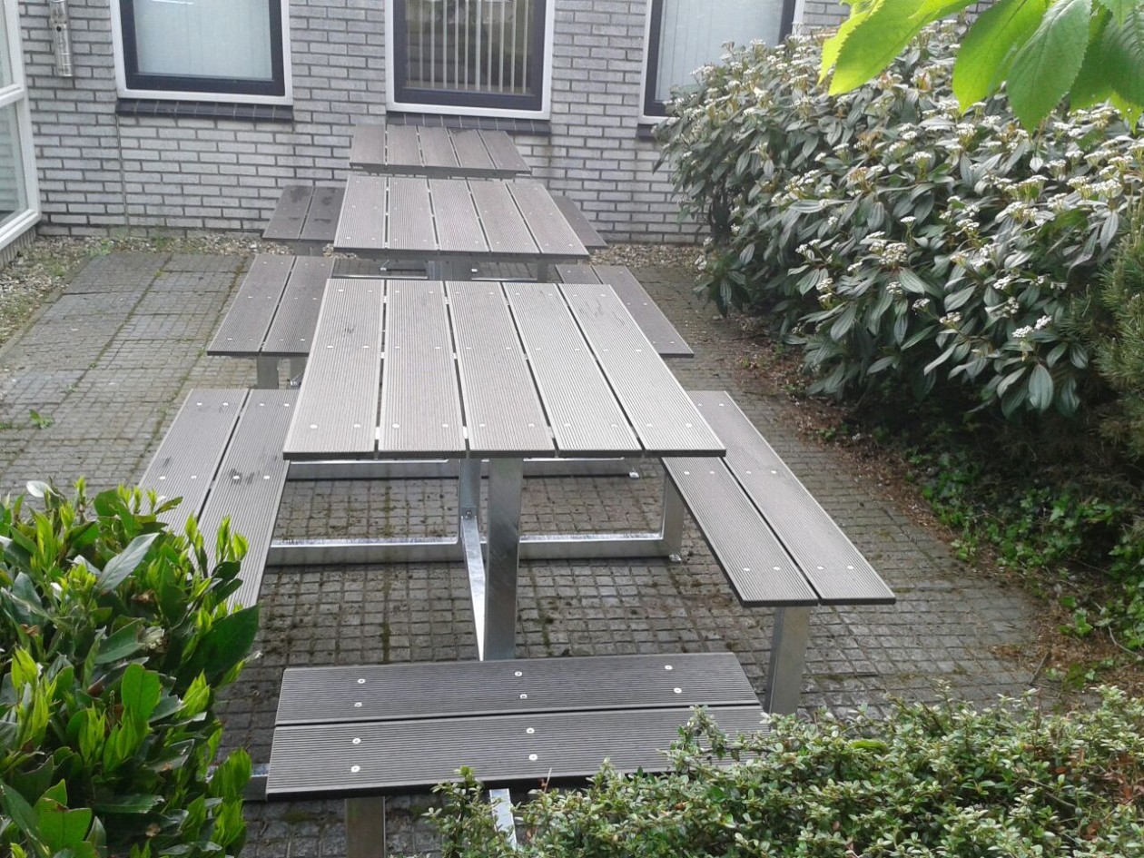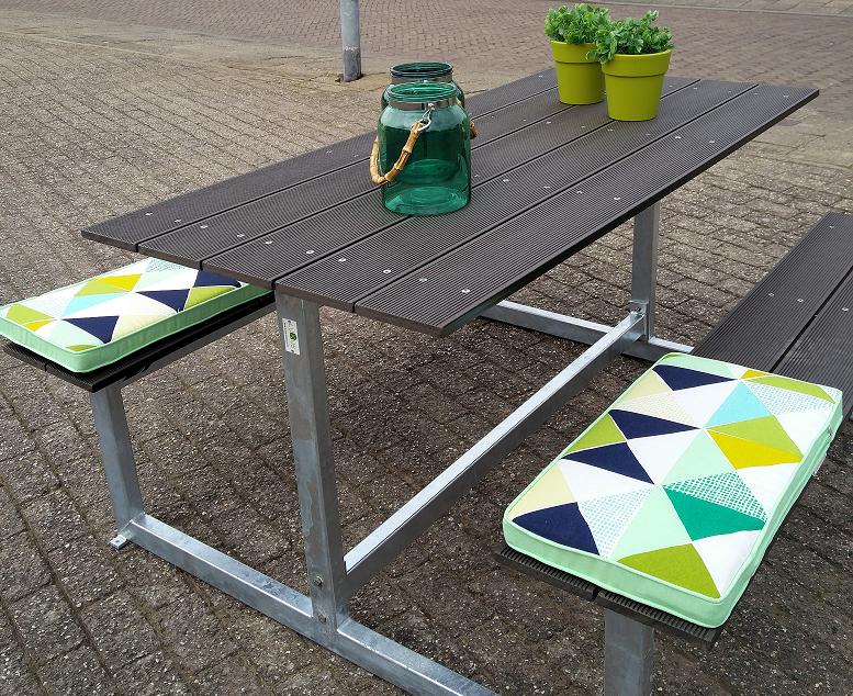Duurzame picknicktafel van verzinkt staal en composiet planken. Composiet is gerecyceld kunststof met bamboe vezels. Onderhoudsarm, kleurvast en rot niet.