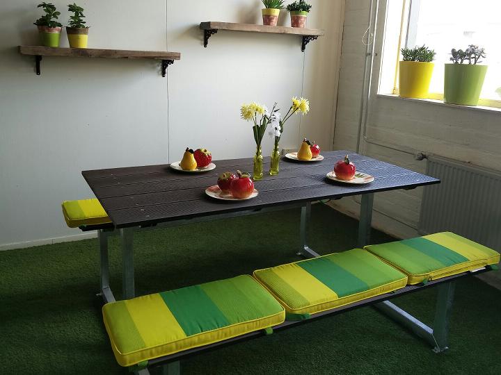 Modieuze picknicktafel uit een zwaar thermisch verzinkt onderstel (waarbij u de benen niet hoeft op te tillen bij het plaatsnemen). Tafel kan altijd buiten blijven staan.