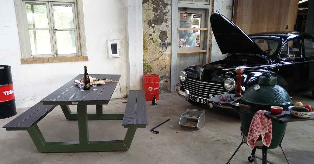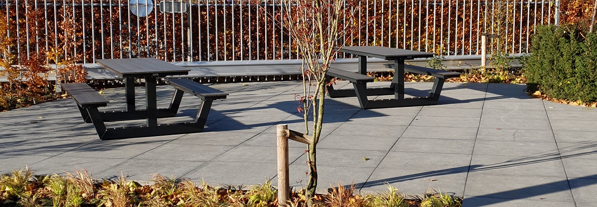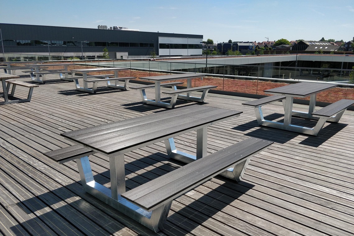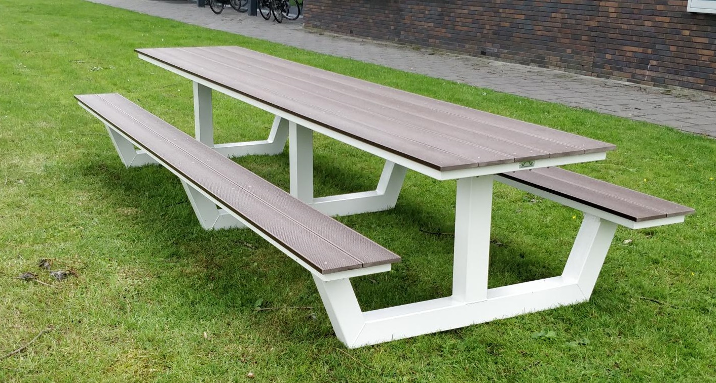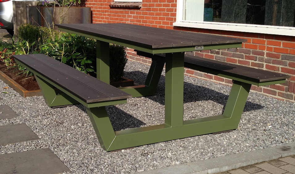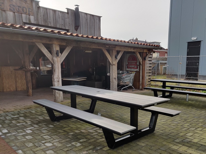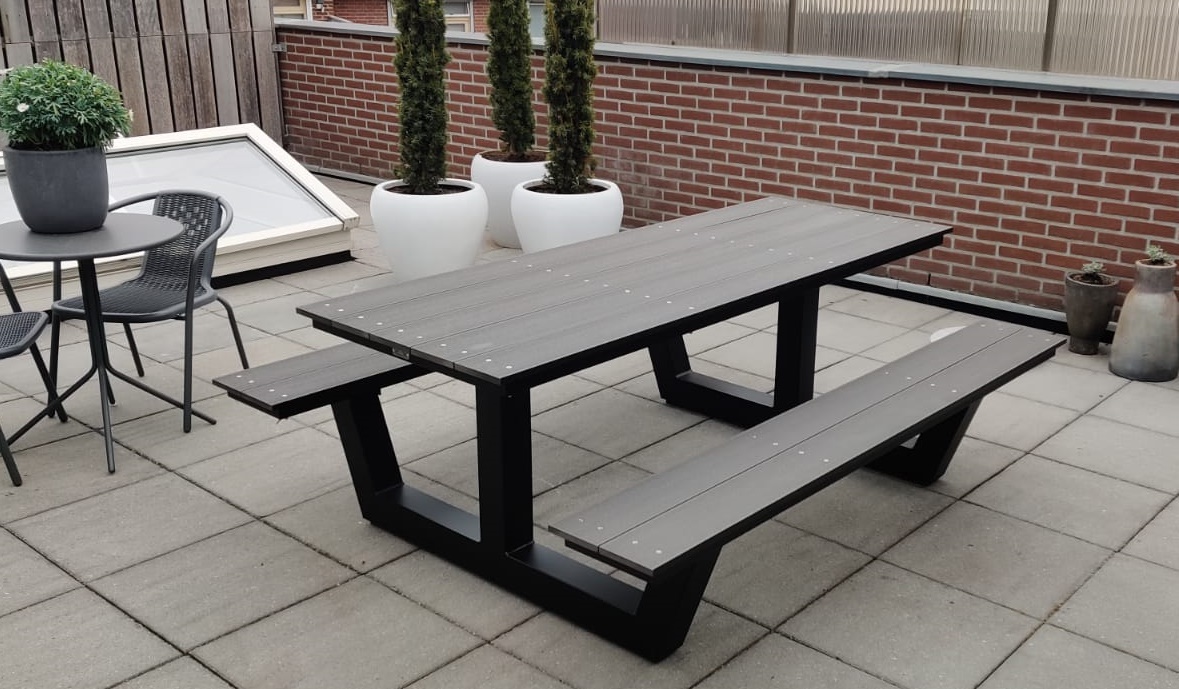 Industrial picknicktafel met makkelijke instap. Robuuste blokpoot tafel voor buiten met een industriële look. Onderhoudsarm en duurzaam Verkrijgbaar in Ral kleur of verzinkt. Met composiet planken.
