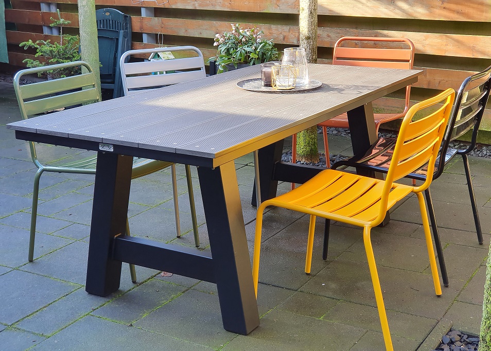 Picknicktafel met stalen frame en composiet planken. Kan altijd buiten blijven staan. Degelijk, duurzaam en onderhoudsarm. Stak design, makkelijke instap.