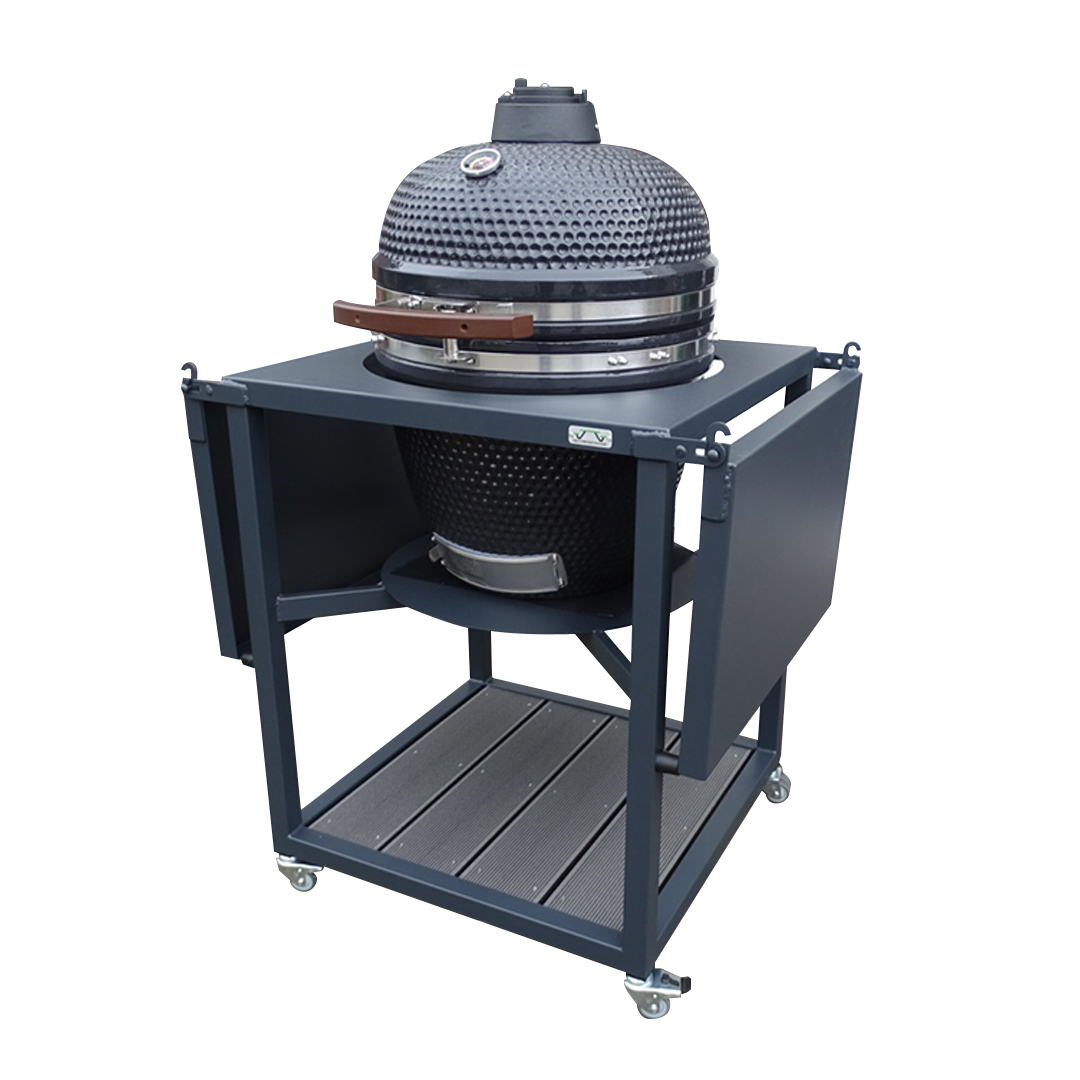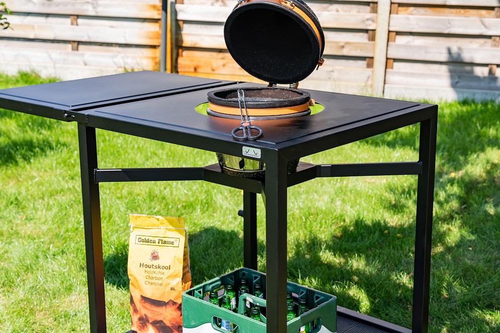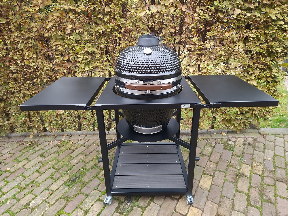 Complete BBQ set. Zwarte kamado 21 inch met stalen tafel op wielen. Incl handige zijkleppen. Goede werkhoogte en zeer makkelijk schoon te maken. laatste set