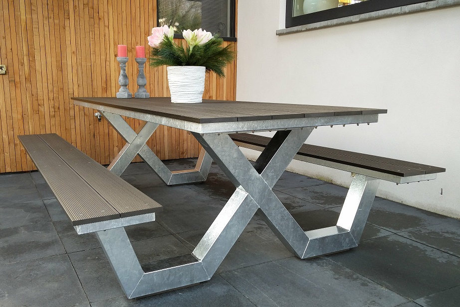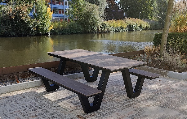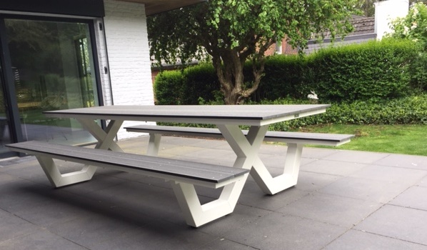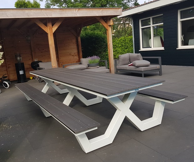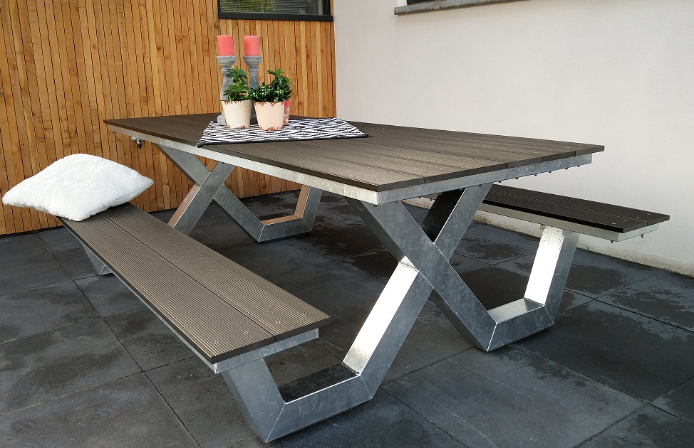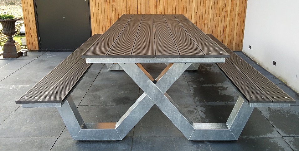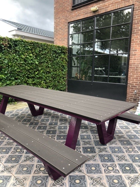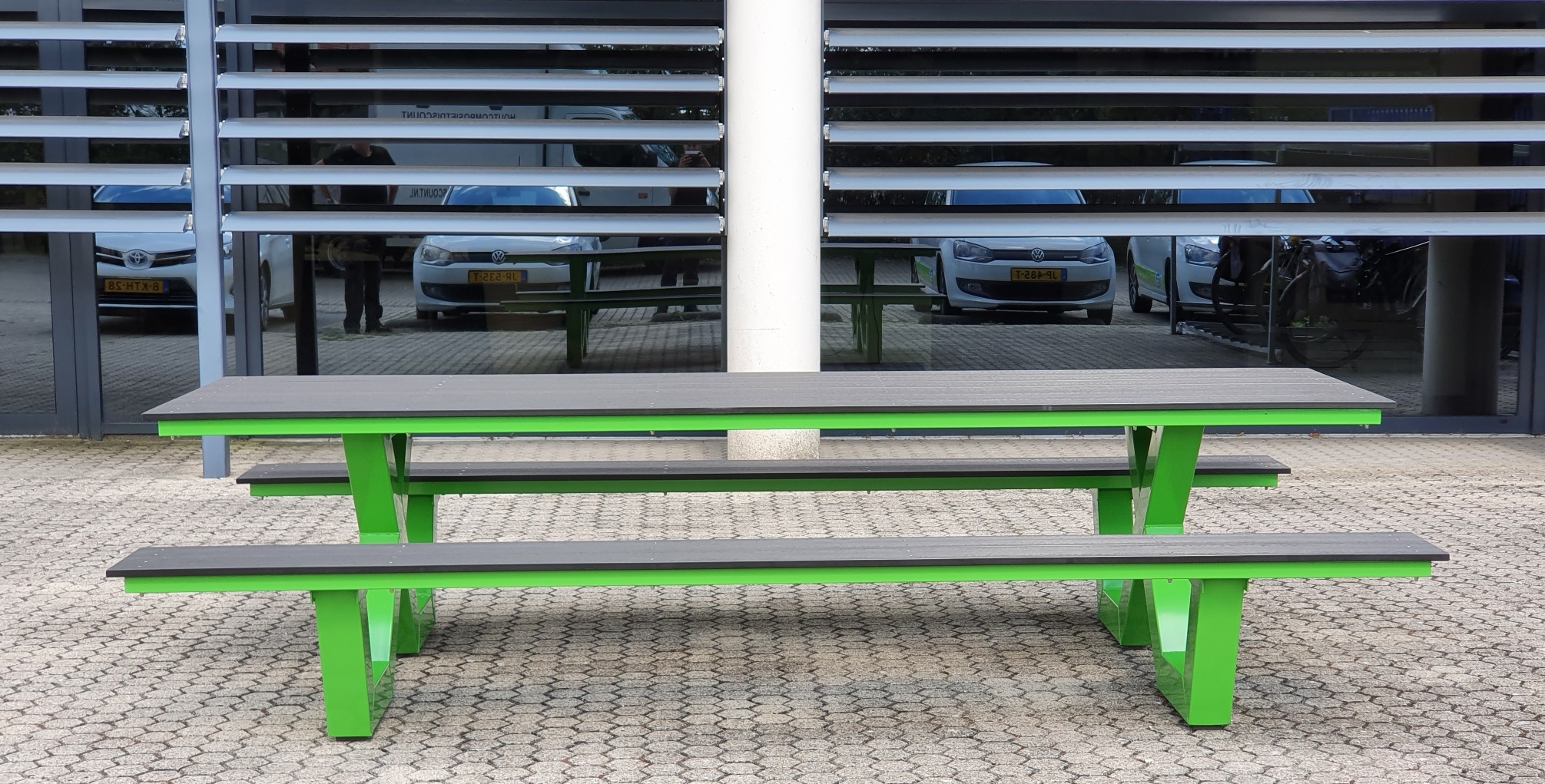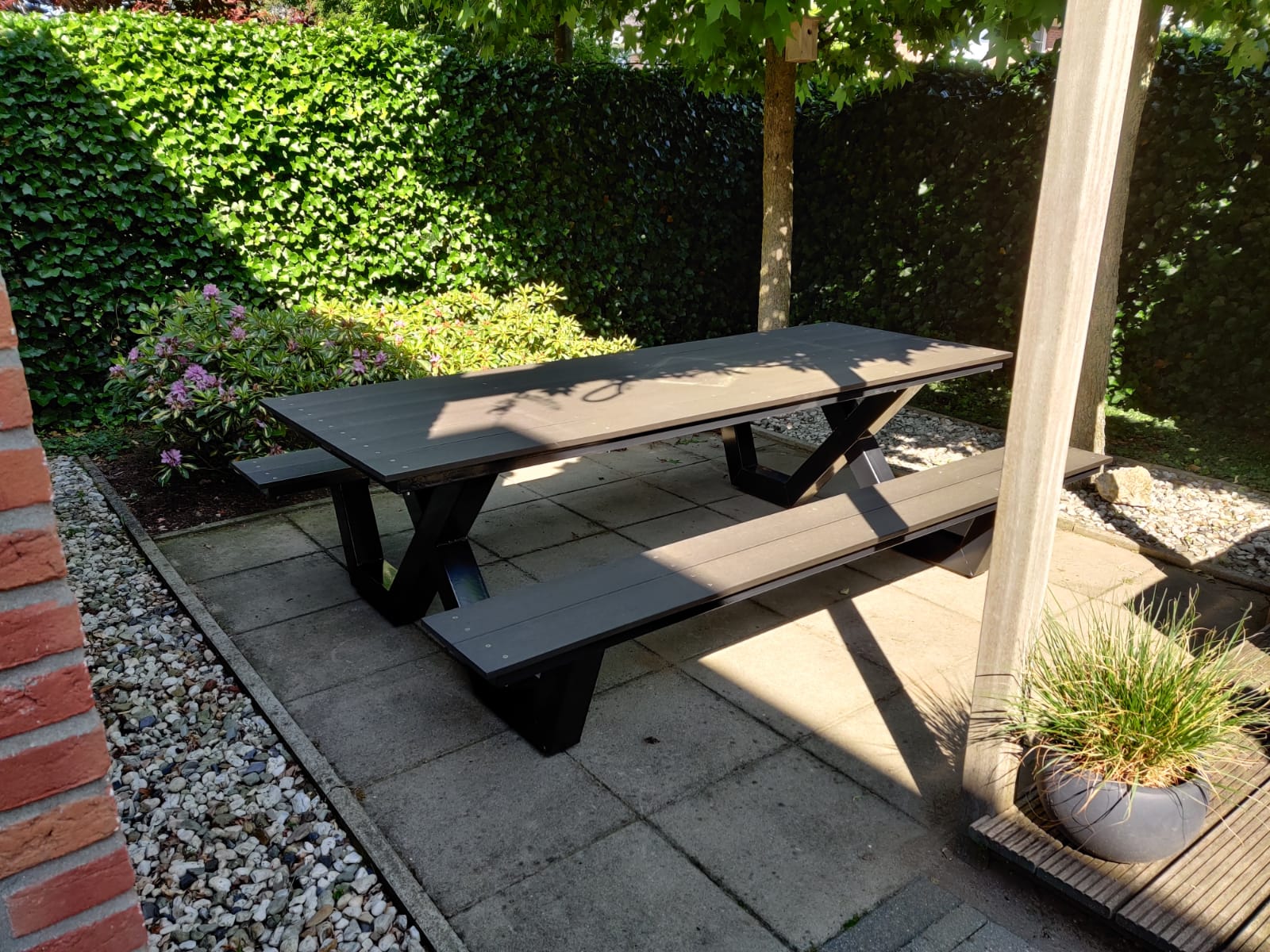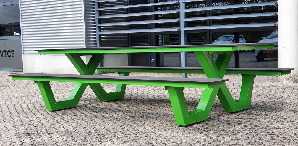 Moderne picknickbank. Gemaakt van staal en houtcomposiet planken. Duurzaam en onderhoudsarm. Keuze uit mooie kleuren coating, geschikt voor elke tuin of terras.