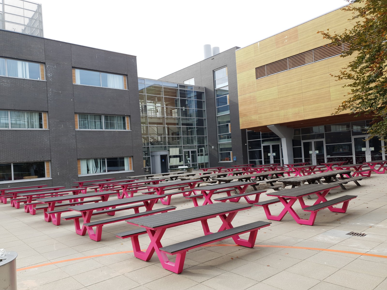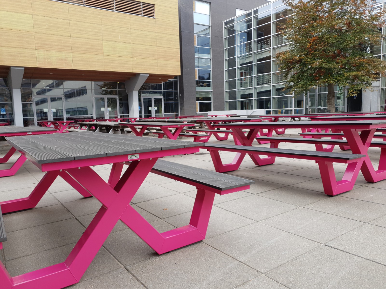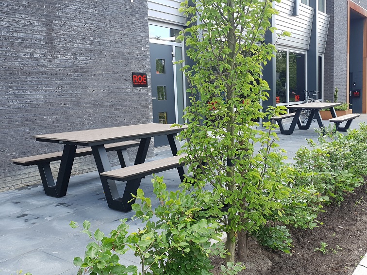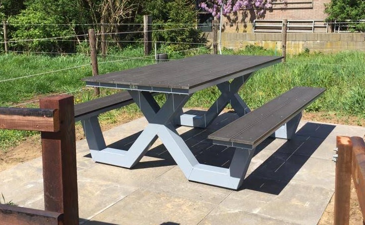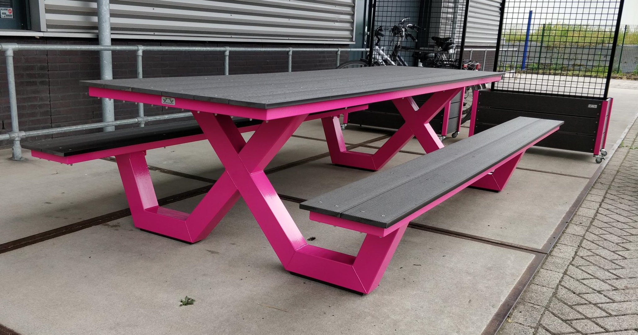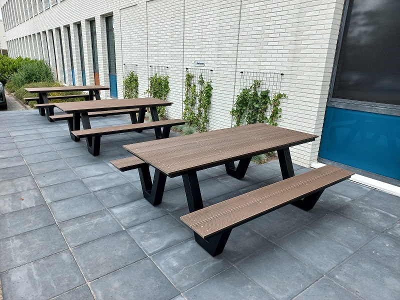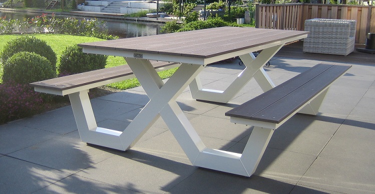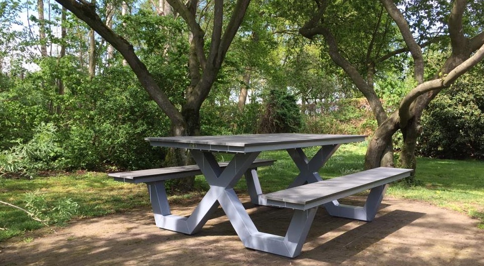Moderne picknickbank. Gemaakt van staal en houtcomposiet planken. Duurzaam en onderhoudsarm. Keuze uit mooie kleuren coating, geschikt voor elke tuin of terras.