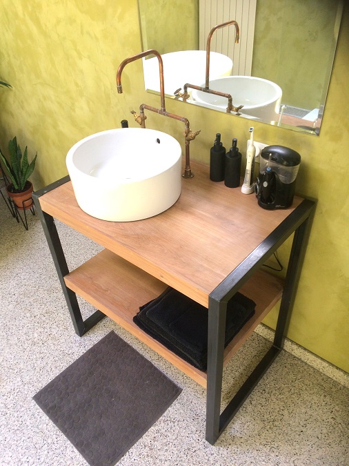 Het bovenblad is 4cm dik massief eikenhout en de kast zelf 2cm dik.