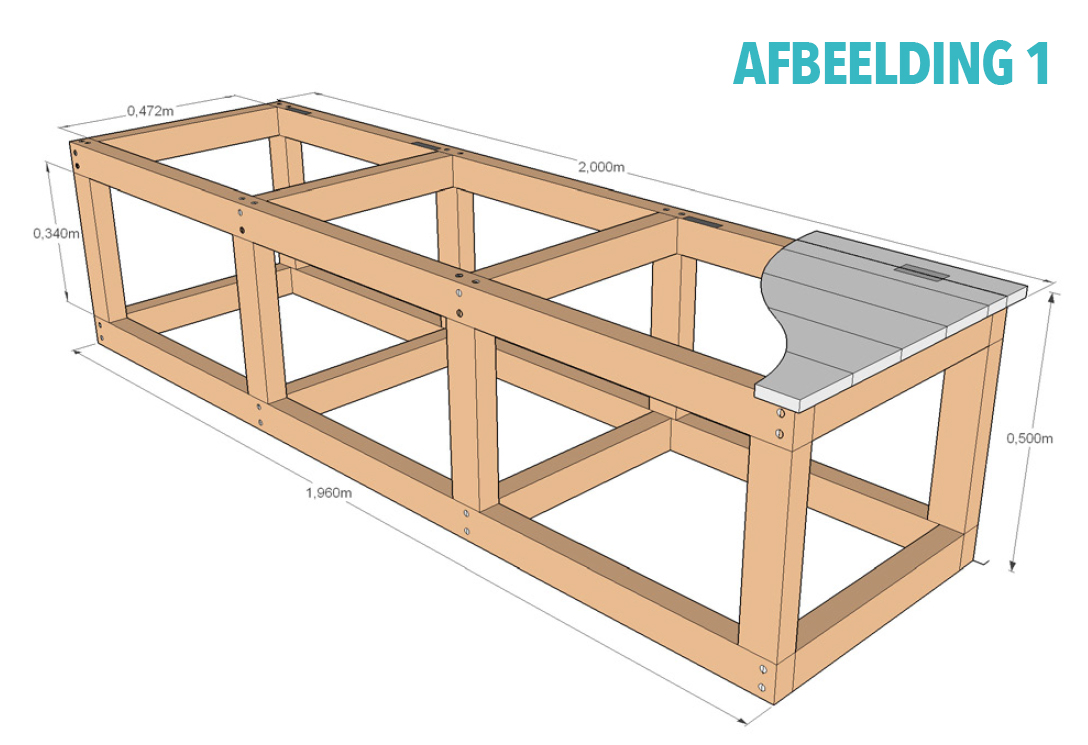 Haal bij bouwmarkt of tuincentrum voldoende houten regels (45x70mm) en planken (19x120mm) - liefst FSC gecertificeerd. Bekijk online afbeelding 1 voor alle afmetingen.