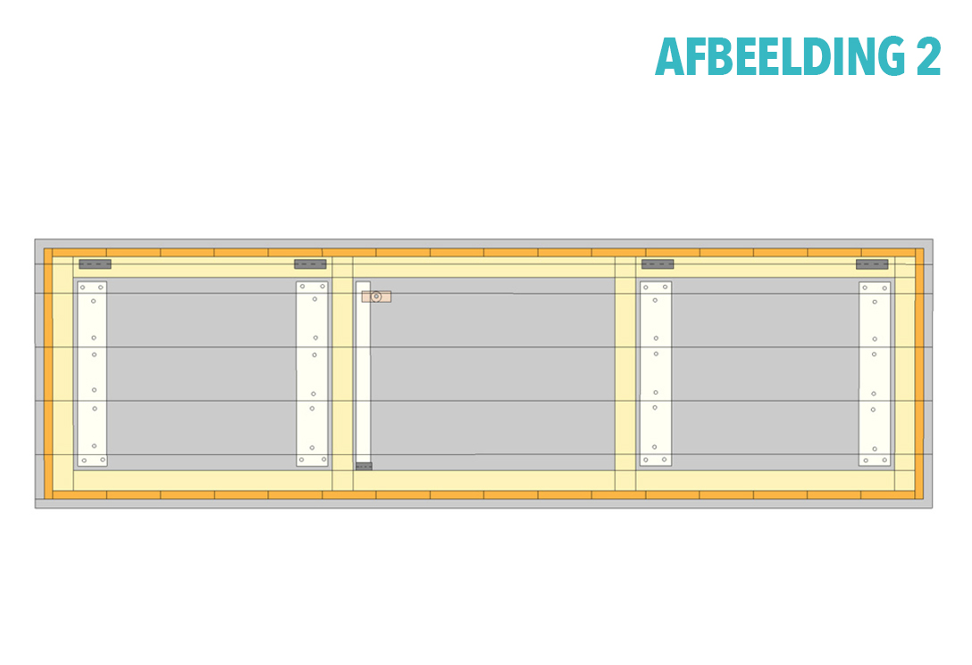 Maak de zitting (die tegelijk een opklapbaar deksel is) van vijf planken. Zaag één van de planken overlangs doormidden en beves-tig een helft direct op een lange rand van het frame; laat dit rondom 2 cm uitsteken. Verbind de overige vier en een halve plank met vier dwarsbalkjes van 45 cm lang. Zie online afbeelding 2.
