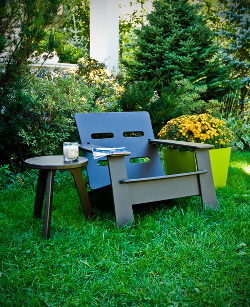 Het design is in het oog springend. Maar wat de strak en vrolijk ogende buitenmeubelen uniek maakt is dat het gemaakt is van gerecyclede kunststof verpakkingen. Zoals bijvoorbeeld melkpakken en wasmiddelflessen van HDPE (High Density Polyetylene).